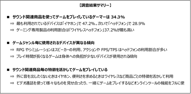 ゲーマーはプレイするゲームのジャンルやプレイスタイルによって、使用するサウンド関連商品を使い分けていることがわかりました。使用感や電池の持ちなどが気になっているゲーマーも少なくありませんでしたが、技術の進歩でこれらは改善していくと思われます。これらの問題が改善されると使用されるデバイスの傾向にも変化が現れるかもしれません。