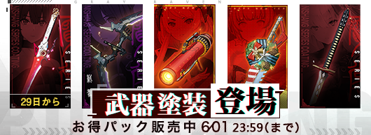ルシア・鴉羽の実装に伴い、専用の戦闘エフェクトが付いたSP塗装、そして武器の塗装が追加!さらに別構造体の塗装や武器の塗装も新しく追加されます。