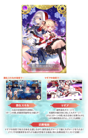本ガチャより、魔法少女「梨花・れん クリスマスver.(CV.伊藤かな恵・尾崎由香)」とメモリア「瞬間を待ちわびて」「今夜のゲストは…」が期間限定で登場いたします。