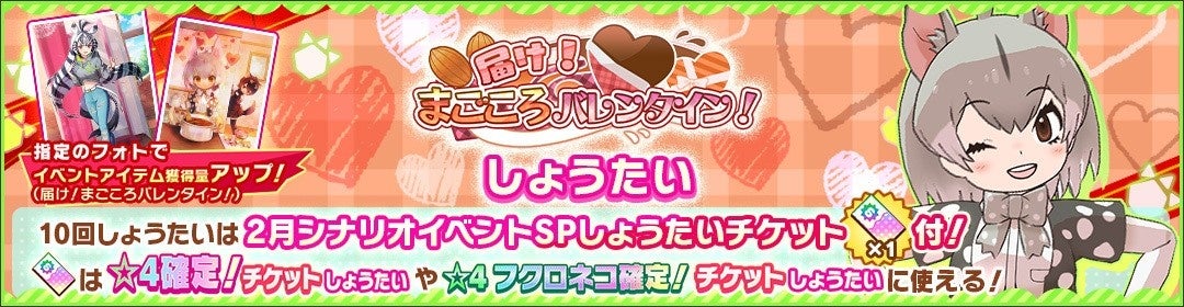 本しょうたいは、新フレンズ☆4「フクロネコ」や新フォト☆4【ときめきオシャレモード】、☆3【チョコレート・トラップ】の出現確率がアップしている期間限定のしょうたいです。なお、☆4「フクロネコ」は本イベントでステータスアップの特効を持っており、フォトはイベントアイテムの獲得量がアップする効果付きとなっています。