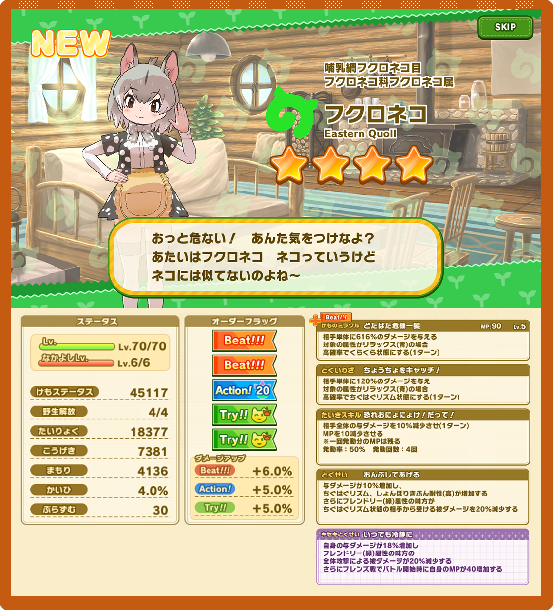 ※表示されているステータスは「Lv.」「なかよしLv.」「野生解放」「けものミラクル」「フォトポケ」が強化された状態です。入手時はLv.1および未強化の状態になります。