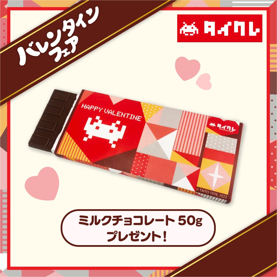バレンタインフェア用の対象バナーがついた景品を10,000タイトーコイン(約1,000円)以上連続でプレイすることで、もれなく「ミルクチョコレート50g」を1つプレゼント!なお、ご発送時はプレイいただいた感謝を込めまして、オリジナルデザインの巻紙付きでお届けいたします。