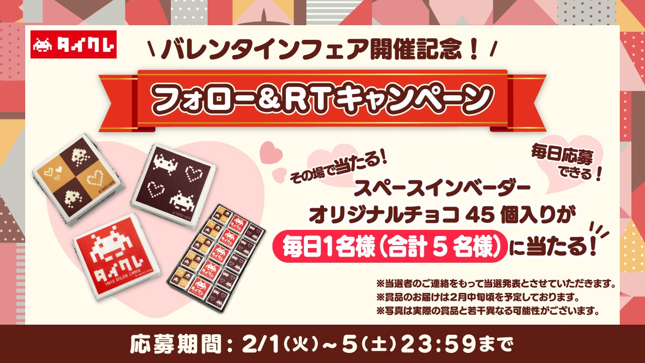 今回の「バレンタインフェア」はチョコレート選びを楽しんでいただけるよう、多種多様なチョコレート景品をご用意しました。また必ずチョコレートがもらえるプレゼント企画や、さらには今回専用に描き下ろしたオリジナルスペースインベーダーデザインのチョコレートが当たるキャンペーンなど、バレンタインをお楽しみいただける多数のコンテンツを展開します。