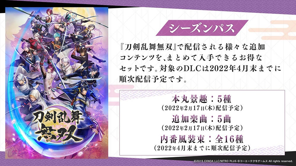 「本丸景趣」と「追加楽曲」は2月17日(木)の本作発売と同時配信、「内番風装束」は4月末までに順次配信予定となっています。すべてのDLCをまとめて購入できるお得なシーズンパスも予定していますので、続報をお待ちください。