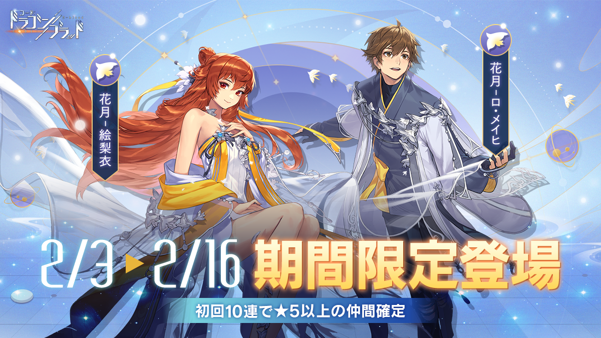 新春イベントに合わせて花月シリーズに新しい仲間「花月・ロ・メイヒ」と「花月・絵梨衣」が登場します! イベント開催期間中、限定ガチャのドロップ率がアップします。さらに、初回の10連ガチャでは★5以上の仲間を必ずゲットできます! ぜひこの機会に新しい仲間をご自身の陣容にお迎えください!