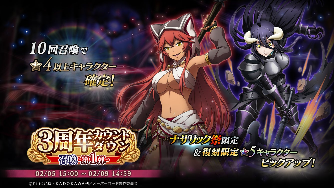 2/5より『有償限定 3周年カウントダウン召喚』を開催!目前となった3周年!ナザリック祭限定★5キャラクター&復刻★5キャラクターが含まれた3周年を記念したカウントダウン召喚を実施いたします!