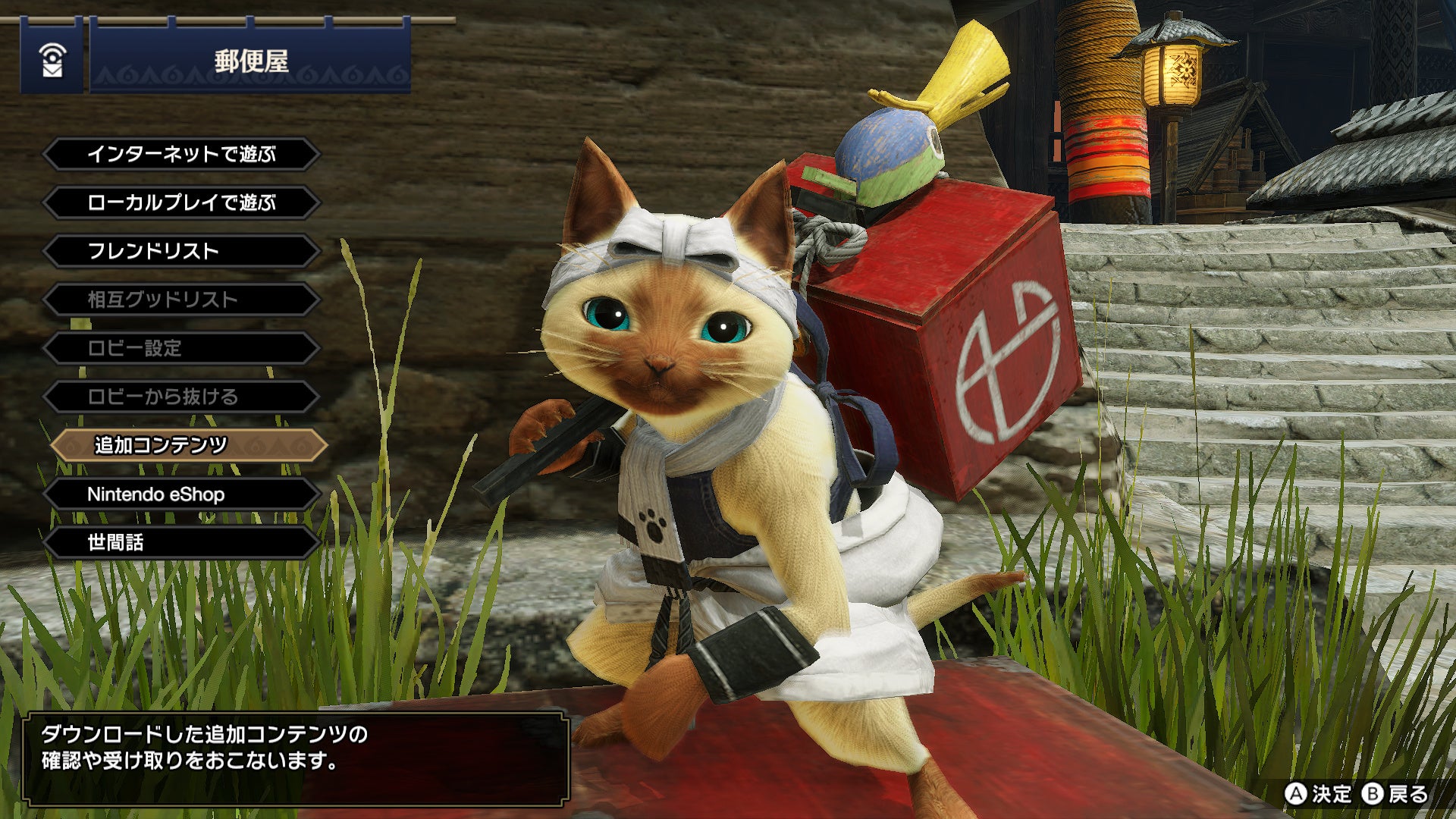 各イベントクエストは、カムラの里にいる「郵便屋」内のメニュー「追加コンテンツ」から受け取ることで、集会所クエストカウンターの「イベントクエスト」から受注することができます。