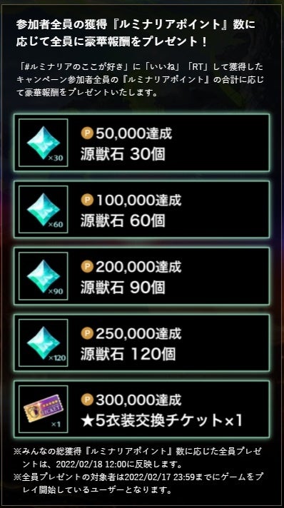 また、参加者全員の「ルミナリアポイント」獲得数に応じて、全員に豪華報酬もプレゼントいたします。詳しくはキャンペーンサイトをご確認ください。