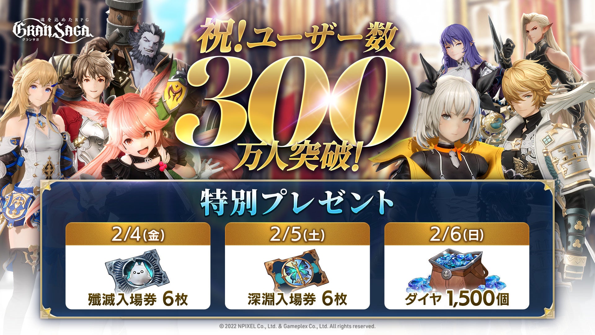 グランサガのユーザー数がおかげさまで300万人を突破いたしました!日頃よりグランサガをプレイして頂いているユーザーの皆様へ感謝の気持ちを込め、特別プレゼントイベントを2月4日(金)~2月6日(日)の3日間に渡り開催いたします!