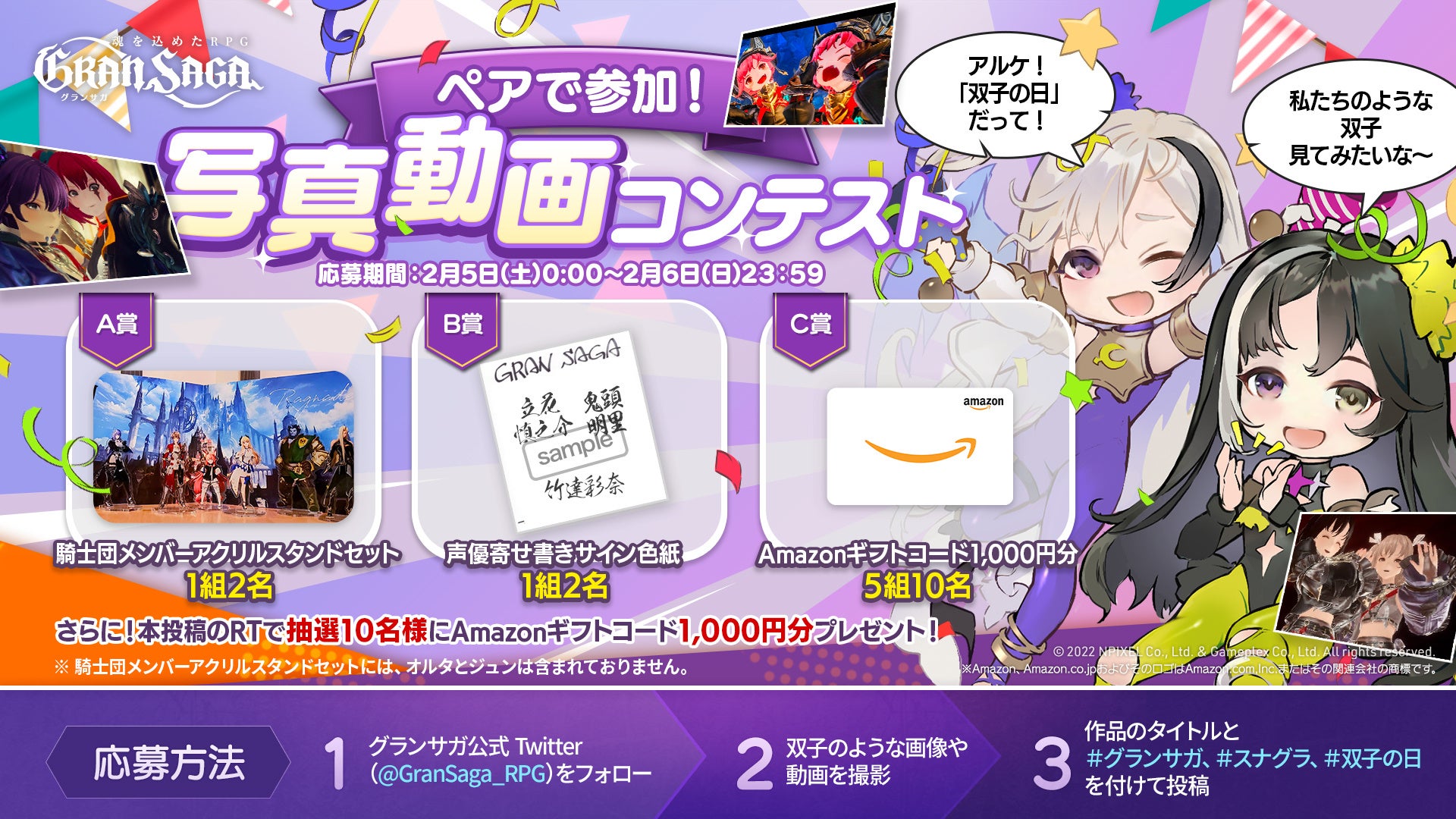 今回は2月5日の「双子の日」「笑顔の日」にちなみ、ツーショットがテーマとなります。ノミネート作品には、グランサガの豪華声優陣によるサイン寄せ書き色紙や、グランサガオリジナルアクリルスタンドなどの豪華賞品が贈られます!奮ってご参加ください!
