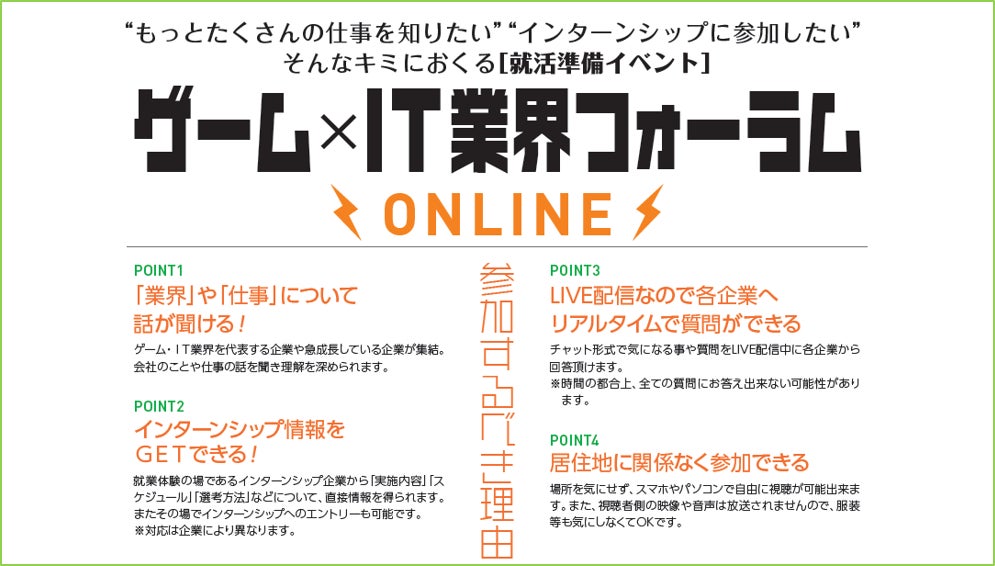 本イベントでは、ゲーム業界やIT業界の仕事研究や制作秘話、インターンシップ情報などを参加者の方限定で、いち早くお届けいたします。ゲーム業界を代表する企業の生の声がリアルタイムで聞ける絶好の機会です。就職活動を始める前の情報収集にもご活用いただけますので、今後ますます発展が期待されるゲーム・IT業界での就職をお考えの学生の皆さまは、ぜひご参加ください。