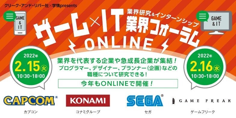 株式会社クリーク・アンド・リバー社と株式会社学情は、2月15日(火)・16日(水)の2日間、来場者がゲーム・IT業界の仕事やプログラマーなどの職種について情報収集と研究ができる、就職活動の準備のためのイベント「ゲーム×IT業界フォーラム」を、オンラインにて開催いたします。