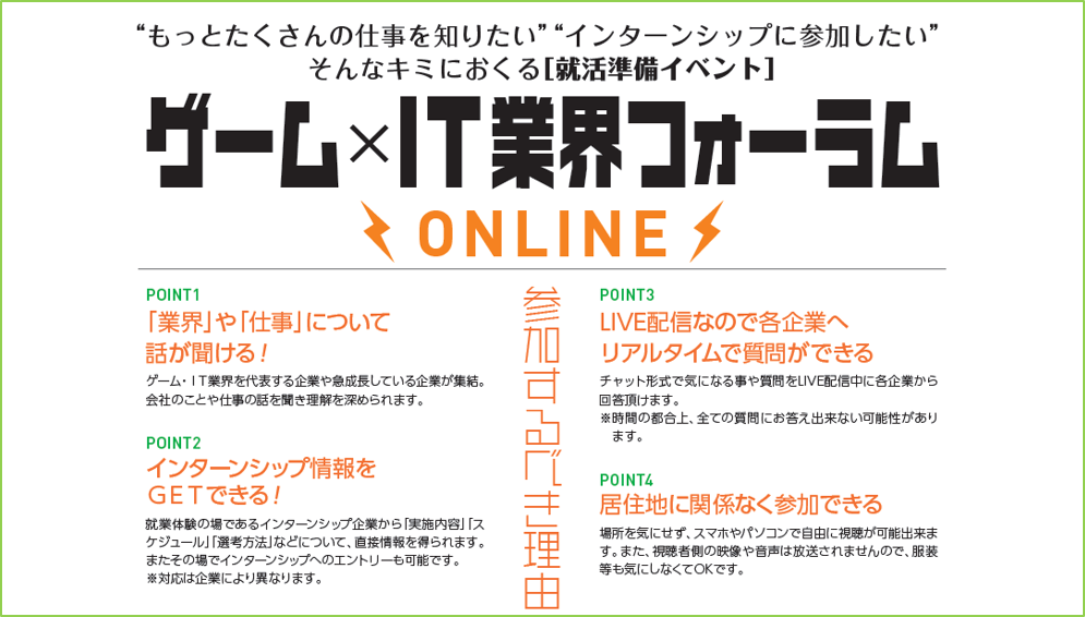 本イベントでは、ゲーム業界やIT業界の仕事研究や制作秘話、インターンシップ情報などを参加者の方限定で、いち早くお届けいたします。ゲーム業界を代表する企業の生の声がリアルタイムで聞ける絶好の機会です。就職活動を始める前の情報収集にもご活用いただけますので、今後ますます発展が期待されるゲーム・IT業界での就職をお考えの学生の皆さまは、ぜひご参加ください。