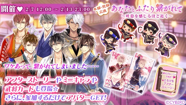また、本編・続編応援キャンペーン「あなたとふたり繋がれて~吐息を感じるほど近く~」や、バレンタインキャンペーン「武将からの逆チョコ♡プレゼントキャンペーン」もスタートします。