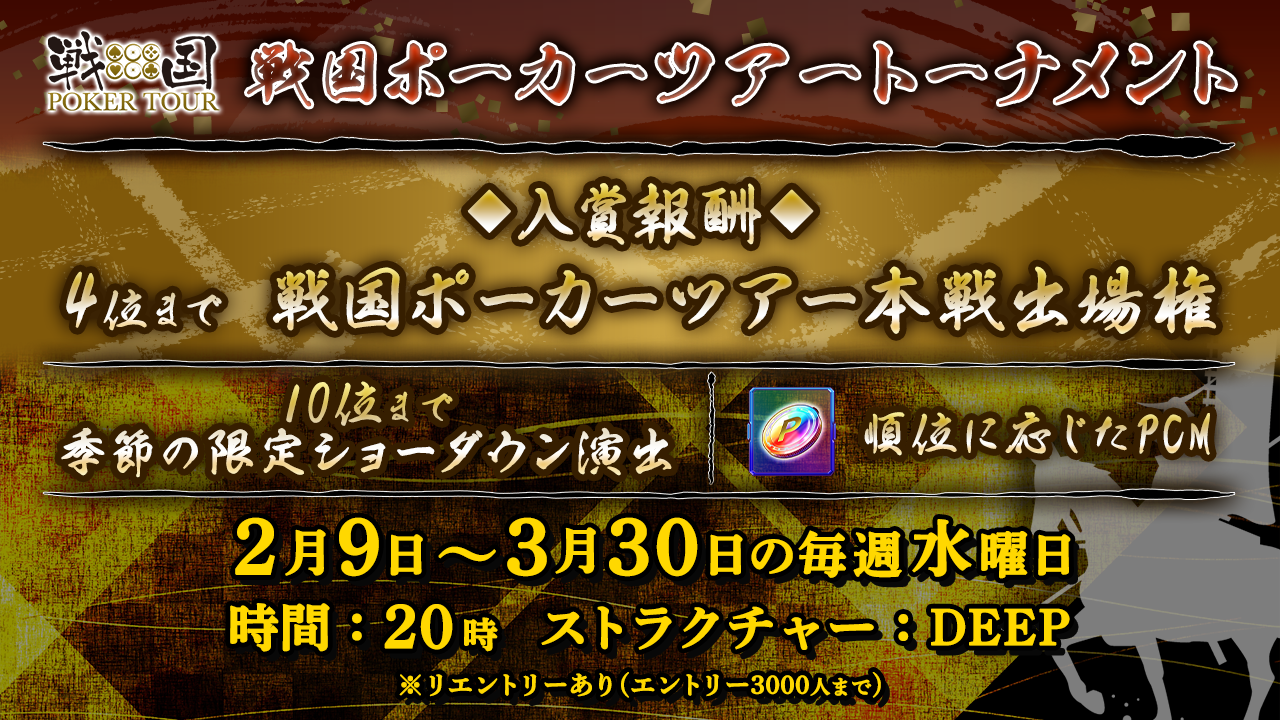 報酬: 各回の上位4位までの入賞者に「戦国ポーカーツアー本戦出場権」