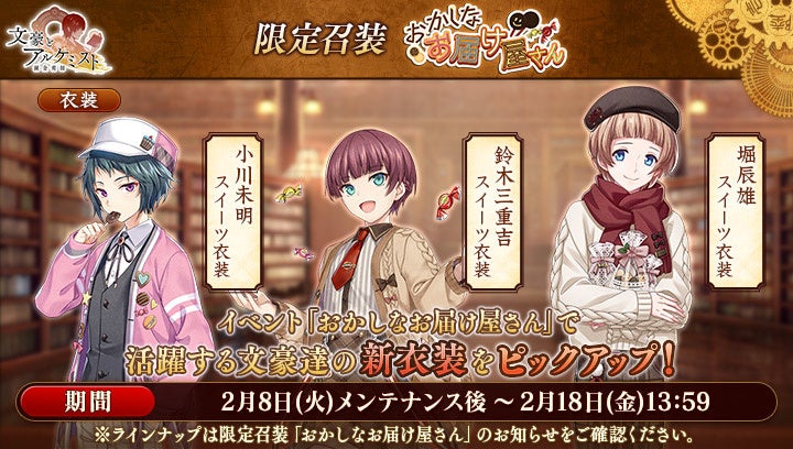 文豪の「衣装」や、会派に装備する事で能力を強化できる「装像」などが入手できるコンテンツ「召装」に、限定召装「おかしなお届け屋さん」が期間限定で登場します。この召装では、イベント『調査任務「おかしなお届け屋さん」』で活躍する「小川未明」「鈴木三重吉」「堀辰雄」の新衣装を一定の確率で入手できます。