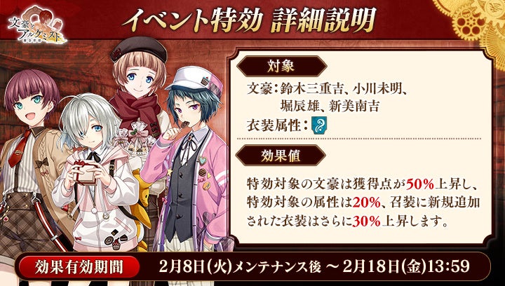 期間中「鈴木三重吉」「小川未明」「堀辰雄」「新美南吉」の衣装を編成して潜書すると、得点の獲得数がそれぞれ50%上昇します。また、「水」属性の衣装を編成して潜書すると、得点の獲得数がそれぞれ20%上昇します。