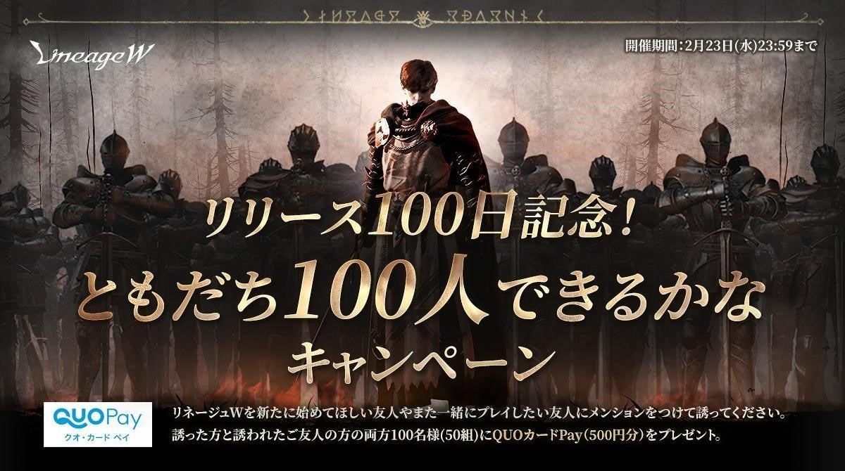 「リネージュW」のリリース100日を記念して、「ともだち100人できるかなキャンペーン」を開催中です。「リネージュW」公式Twitterをフォローし、キャンペーンツイートの「Tweet #リネージュWを一緒にプレイしよう」のボタンを押して、これから一緒にプレイしたいご友人、もう一度一緒にプレイしたいご友人をメンションしてツイートしてください。ツイートした方とメンションされた方のペアを対象に、抽選で50組100名様へ「QUOカードPay」500円分をプレゼントします。