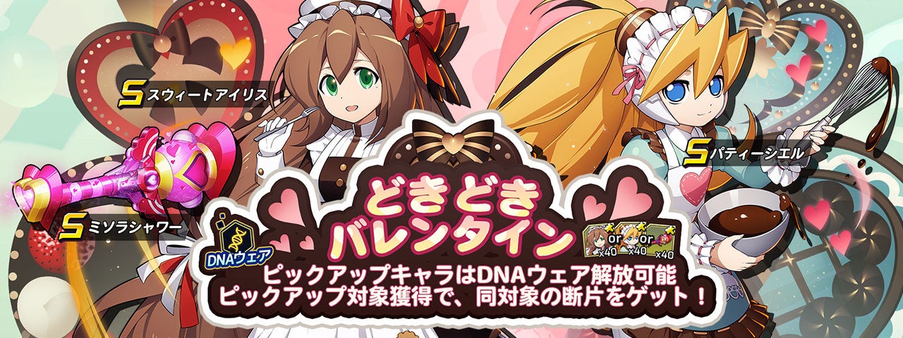 2月23日(水)13:00まで「どきどきバレンタイン」カプセル復刻開催!Sクラスキャラ「スウィートアイリス」「パティーシエル」、Sクラス武器「ミソラシャワー」の出現率がUP!