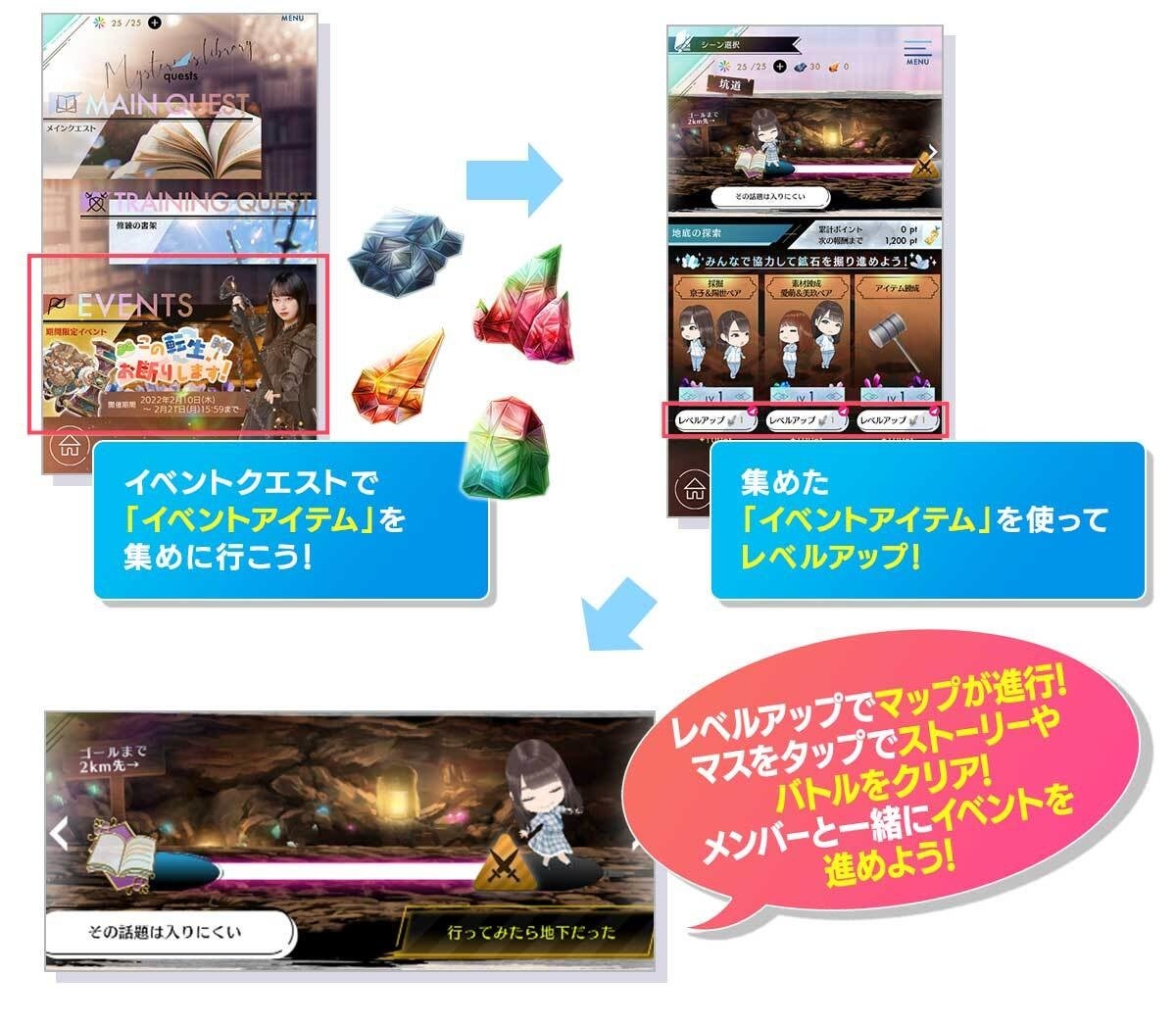 イベントアイテムを集めてメンバーをレベルアップ!レベルアップするごとにマップが進行し、イベントストーリーやバトルが開放されます。