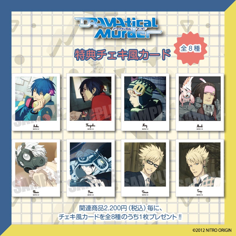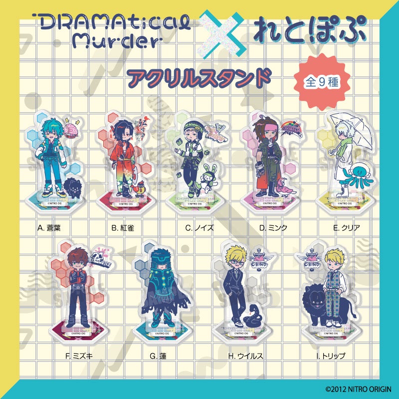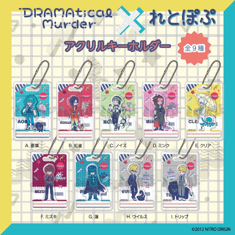 アニメ、ゲームあらゆるジャンルのキャラクター商品や販促グッズの企画、製造、販売をする株式会社プレイフルマインドカンパニー(代表取締役:大塚清隆、本社:東京都台東区)は『DRAMAtical Murder』より、公式イラストを使用した迫力ある【ミニ色紙】や【特大マウスパッド】、描き起こしイラスト「れとぽぷシリーズ」の【ミニアクリルスタンド】・【アクリルキーホルダー】などを2月10日(木)より下記販売サイトにて予約販売を開始致します。