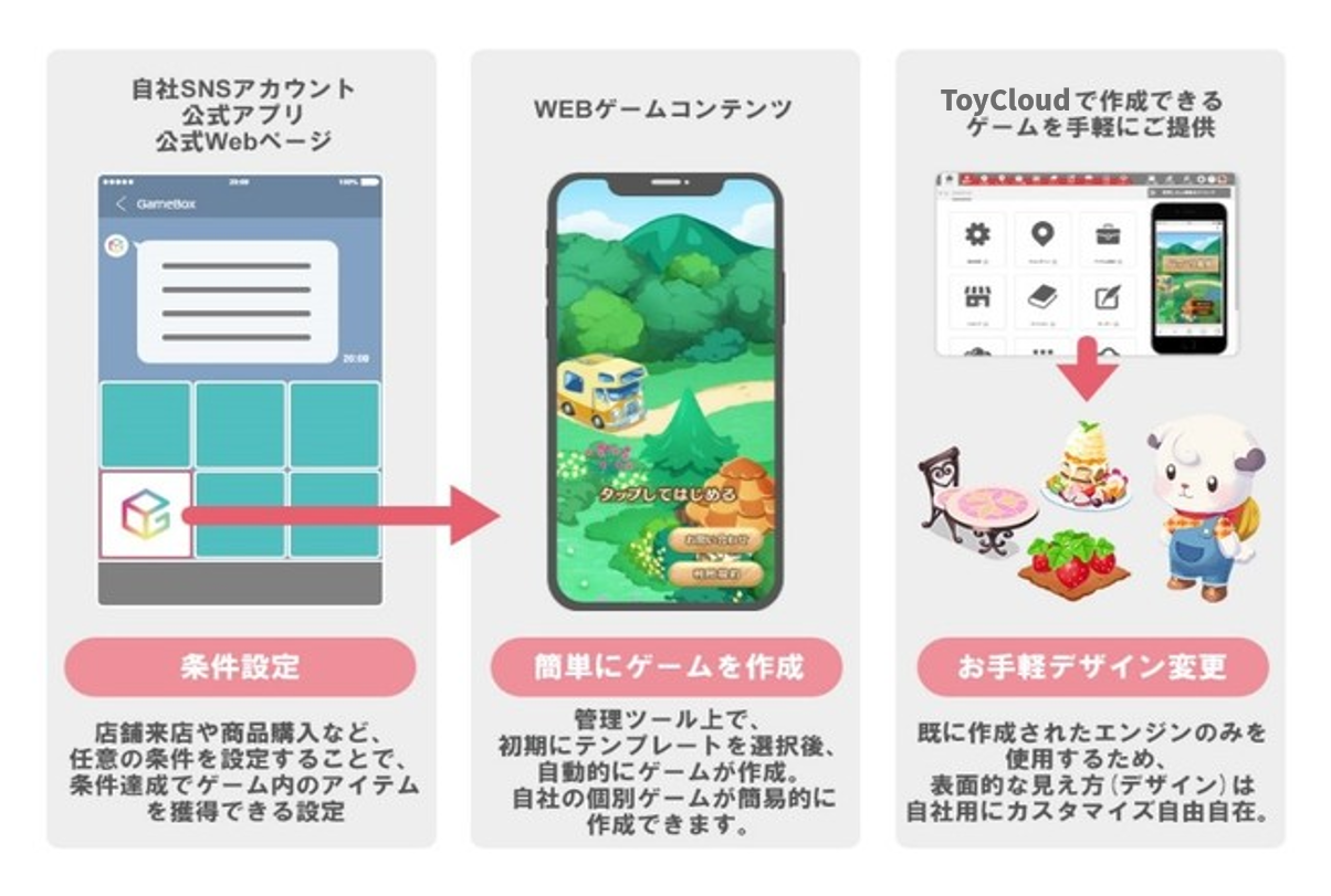 この「ToyCloud」は、コンテンツマーケティングに活用できるゲームコンテンツをHTML5またはアプリで従来の3分1程のコストかつ、最短数か月で開発が可能です。
