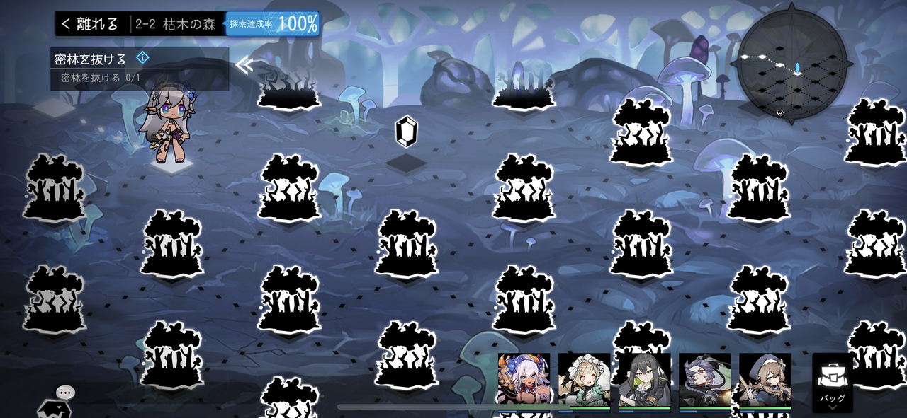 正解はこちらのルートです。木を一つ一つよく見るとエレメントではない太い樹木が紛れているため、そちらを選んで通ることで、幻術の邪魔を受けずに迷宮の奥へ進むことができます。