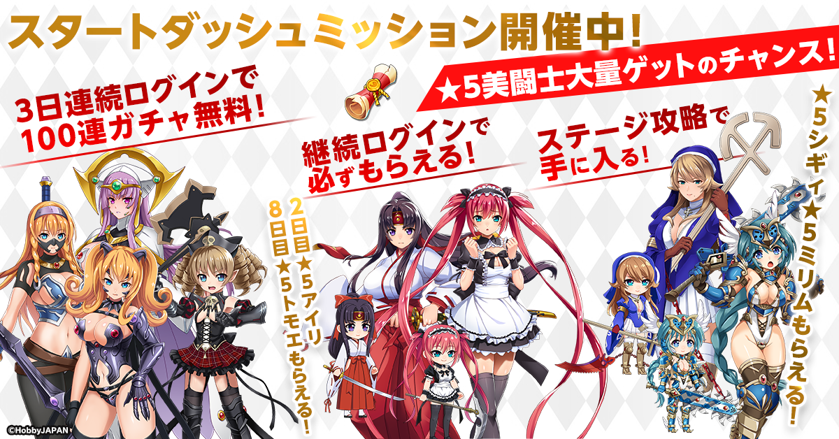 ゲーム開始から8日間、ログインするだけで毎日必ずアイテムや美闘士が手に入ります。2日目には★5アイリ(冥土の召使い)が、8日目のログインで★5トモエ(ヒノモト剣術)を獲得することが可能です。
