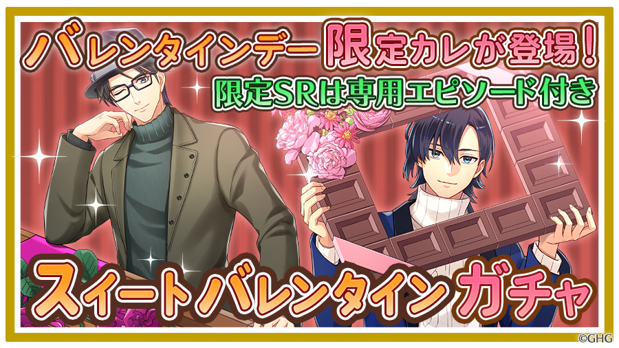※バレンタインデー交換券はスイートバレンタインガチャの新登場SSR・SRフォトカードの他、バレンタインデーの装いのカレが全員集合した特別なSRフォトカードとも交換可能です。