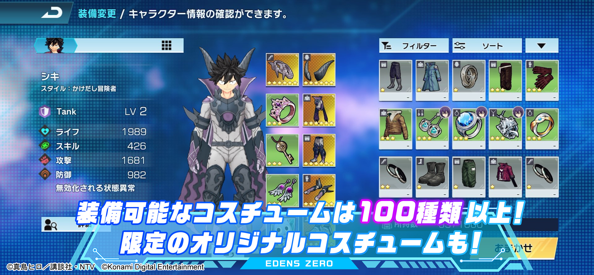 本作は、スキルや装備を組み合わせて理想のビルドを追い求めながらダンジョンを進めていく見下ろし型アクションRPGです。原作の名シーンの数々を忠実に再現したストーリーに加え、オリジナルストーリーも搭載されます。特殊能力「エーテルギア」を駆使した各キャラクターのド派手なアクションシーンは必見です!さらに、ゲーム内で着せ替え可能なコスチュームは100種類以上!!原作者である真島ヒロ先生直筆のオリジナルコスチュームも登場します。