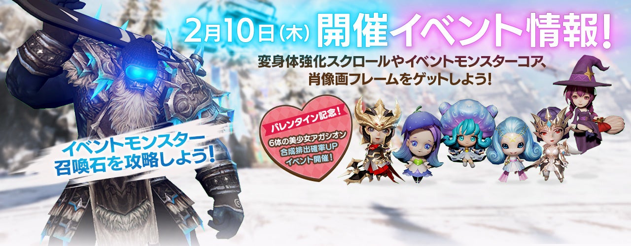 本アップデートよりバレンタインを記念して、「スピカ」、「クラゲ少女」、「おやゆび姫」、「ホウキの魔女」、「ティルマエル」、「マフネル」の6体の女性型アガシオンのソウルとチャーム合成時の排出確率が300%増加する「アガシオン合成確立アップイベント」を開催いたします。この機会にお気に入りのアガシオンを獲得してください!