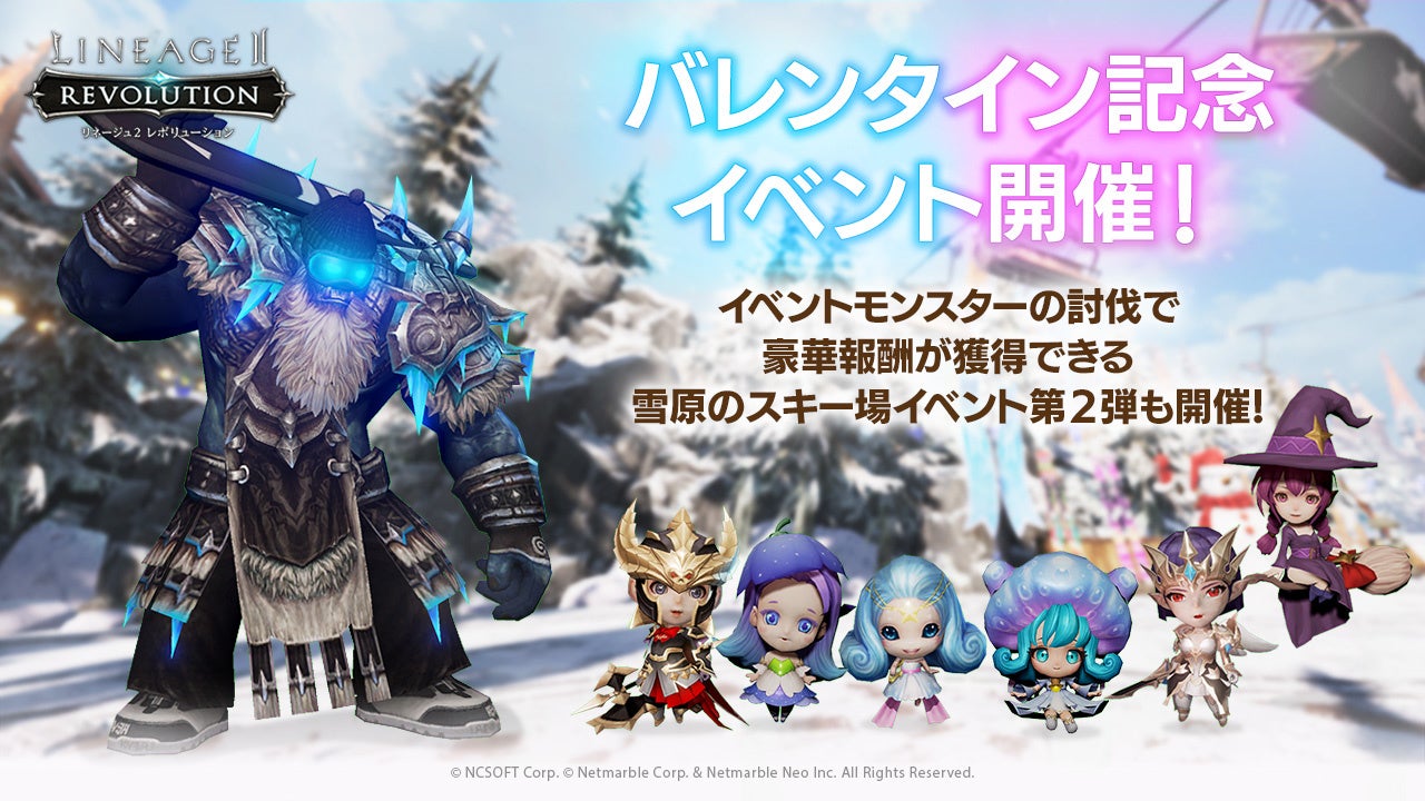 ネットマーブルは、スマートフォン向け超巨大マルチバトルRPG 『リネージュ2 レボリューション (Lineage2 Revolution)』において、2月10日(木)よりバレンタイン記念イベントを開催することをお知らせいたします。また、豪華報酬が手に入るスキー場をテーマにしたイベントの第2弾も同時開催いたします。