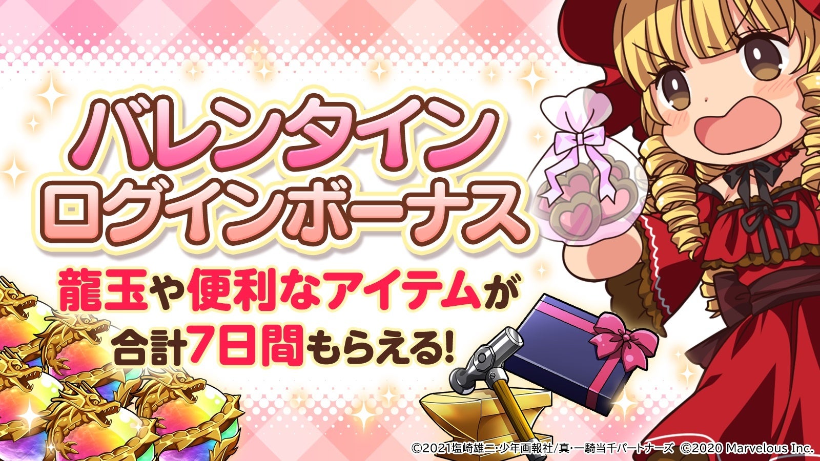 バレンタインログインボーナスでは、ガチャなどで使用できる龍玉や強化素材など豪華特典をもらうことができます!