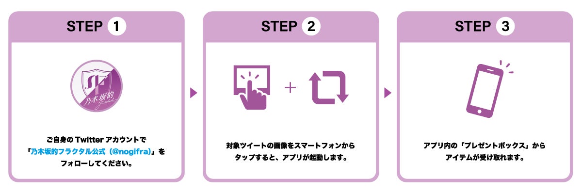 キャンペーン期間中、乃木坂的フラクタル公式Twitter(https://twitter.com/nogifra)にて、ゲーム内アイテムが貰える「Twitterキャンペーン」を開催いたします。投稿に添付された「画像」をタップするだけで、その場で「ゲーム内アイテム」がもらえますので、ぜひご参加ください。