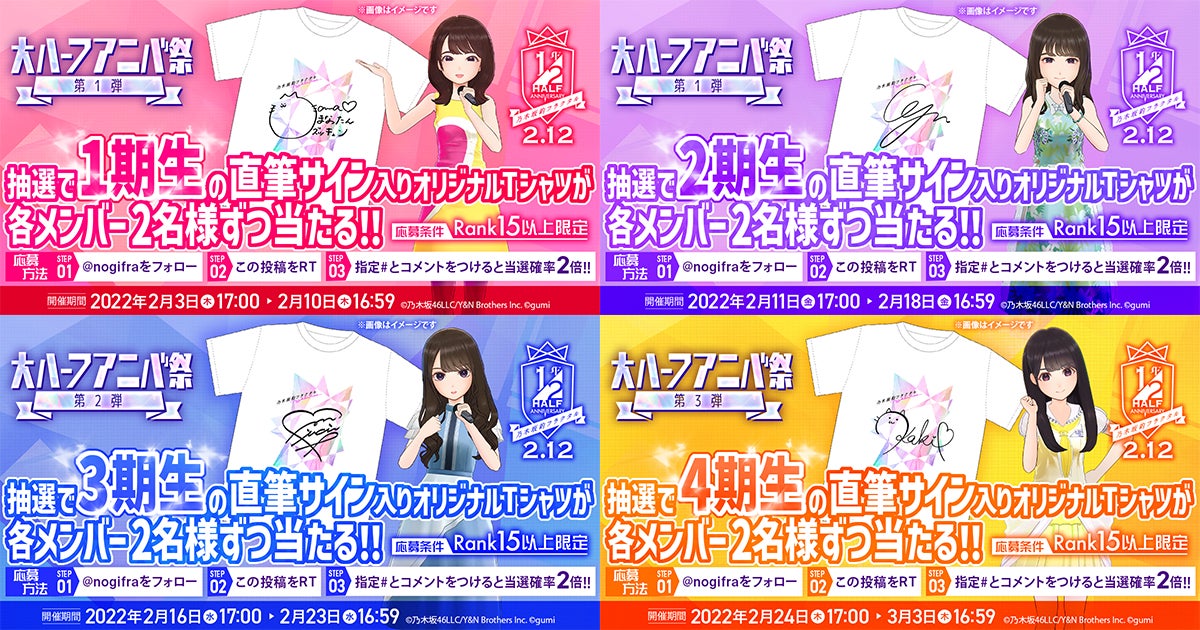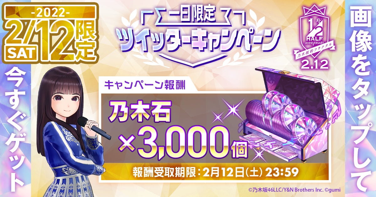 株式会社gumi(本社:東京都新宿区、代表取締役社長:川本寛之)は、『乃木坂的フラクタル』(以下、『乃木フラ』)が、2022年2月12日(土)をもってリリースから半年を迎えることを記念して、「大ハーフアニバ祭」を、2022年2月3日(木)より開催していることをお知らせいたします。