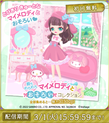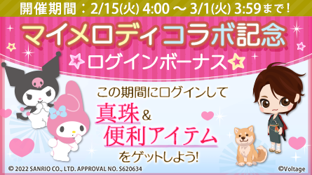 アプリ内にてマイメロディとのコラボを記念したログインボーナスを実施いたします。真珠などのアプリ内アイテムを期間中毎日手に入れることができます。