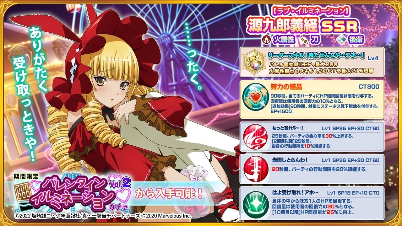 新たに「【ラブ・イルミネーション】源九郎義経」(CV:巽悠衣子)」が登場。