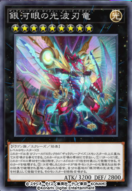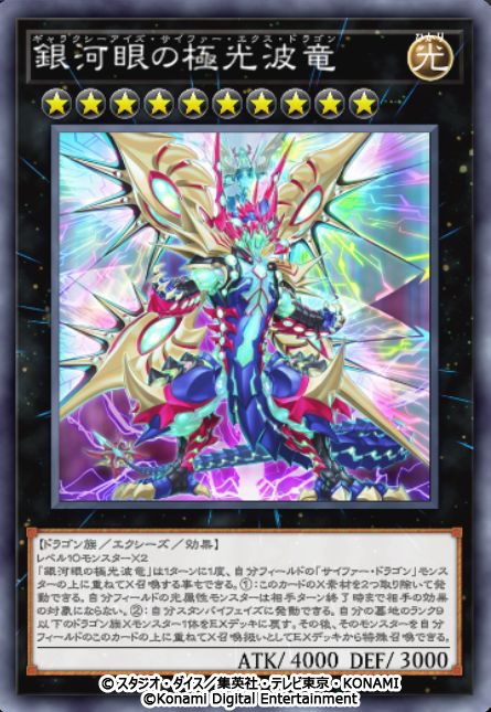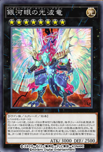 このカードは自分フィールドのランク8の「ギャラクシーアイズ」Xモンスターの上に重ねてX召喚する事もできる。このカードはX召喚の素材にできない。①:1ターンに1度、このカードのX素材を1つ取り除き、フィールドのカード1枚を対象として発動できる。そのカードを破壊する。②:X召喚したこのカードが相手モンスターの攻撃または相手の効果で破壊され墓地へ送られた場合、自分の墓地の「銀河眼の光波竜」1体を対象として発動できる。そのモンスターを特殊召喚する。