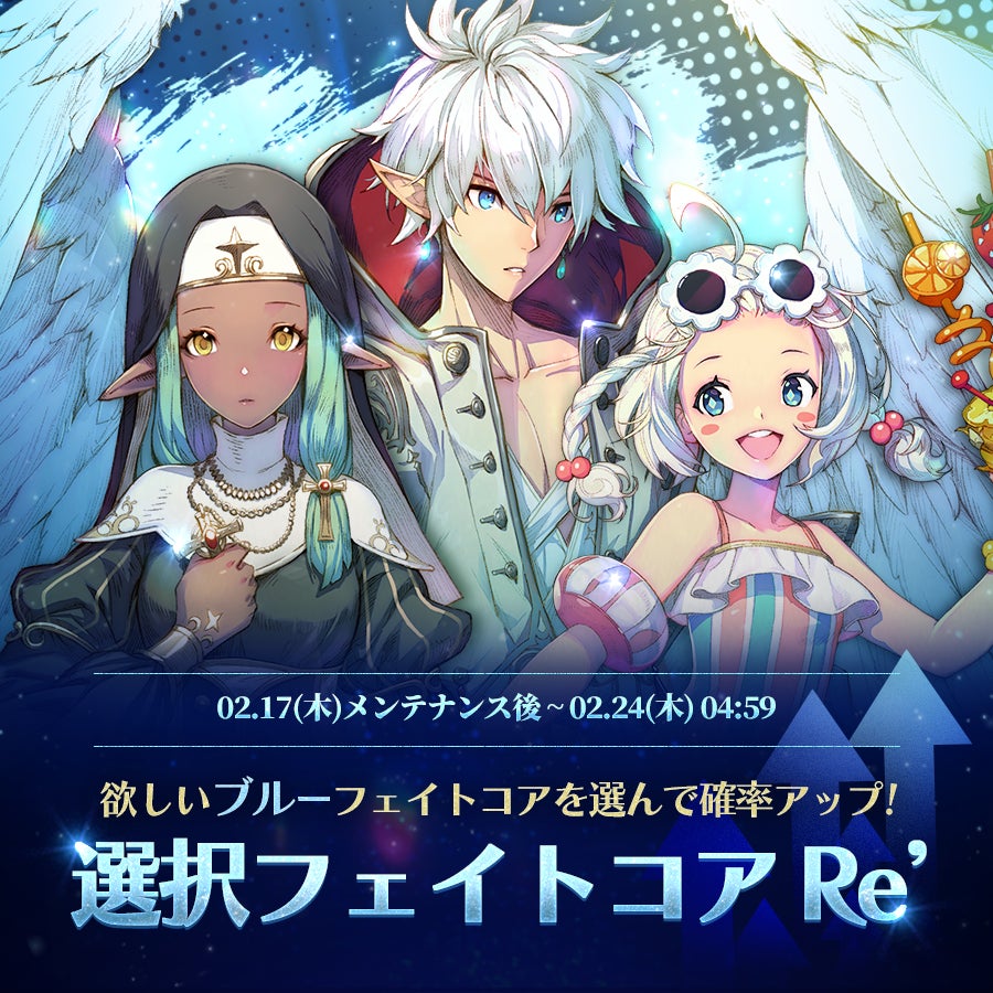開催期間中は「王位継承者_レイケル」を始め「ブラックムーン_バラカ」、「少女の夏_ヤオ」、「火山のように情熱的な_トップアーキ」、「ビートシューター_イドゥン」など11体のブルーフェイトコアの内、選択した1体のフェイトコアが通常より高い確率で英雄本体とフェイトコアを一緒に獲得することができます。お気に入りのフェイトコアをGetできるチャンスをお見逃しなく!