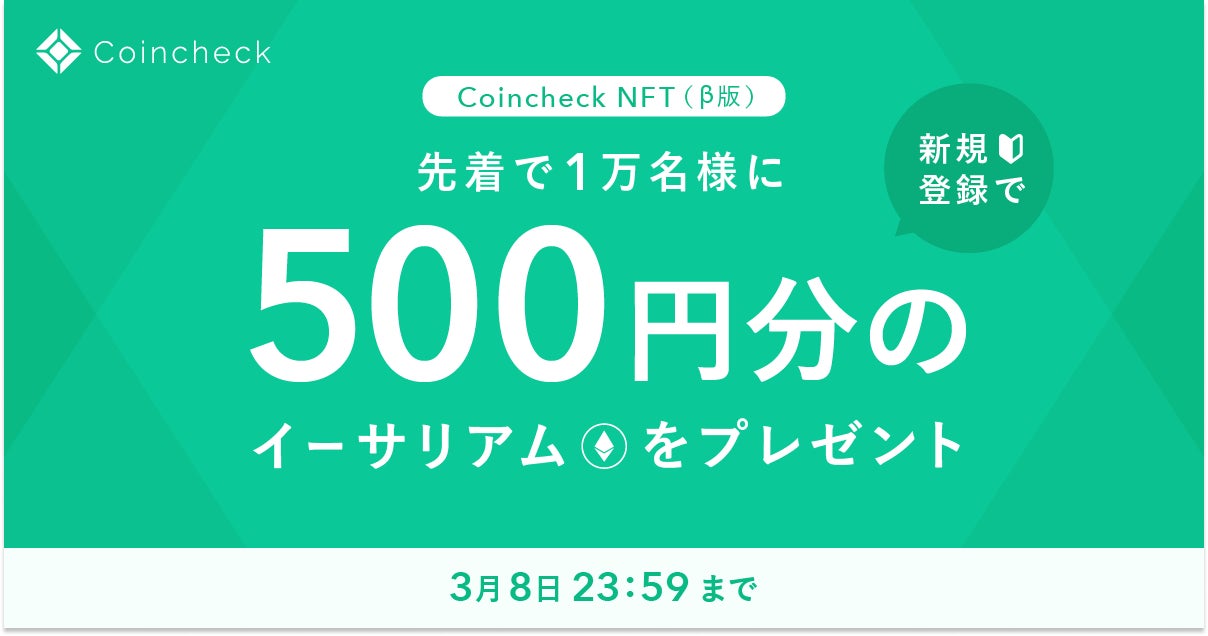 コインチェック株式会社(本社:東京都渋谷区、代表取締役:蓮尾 聡)の提供するCNFTマーケットプレイス「Coincheck NFT(β版)」では、本日より新規登録で先着1万名に500円相当のETHがもらえるキャンペーンを実施いたします。