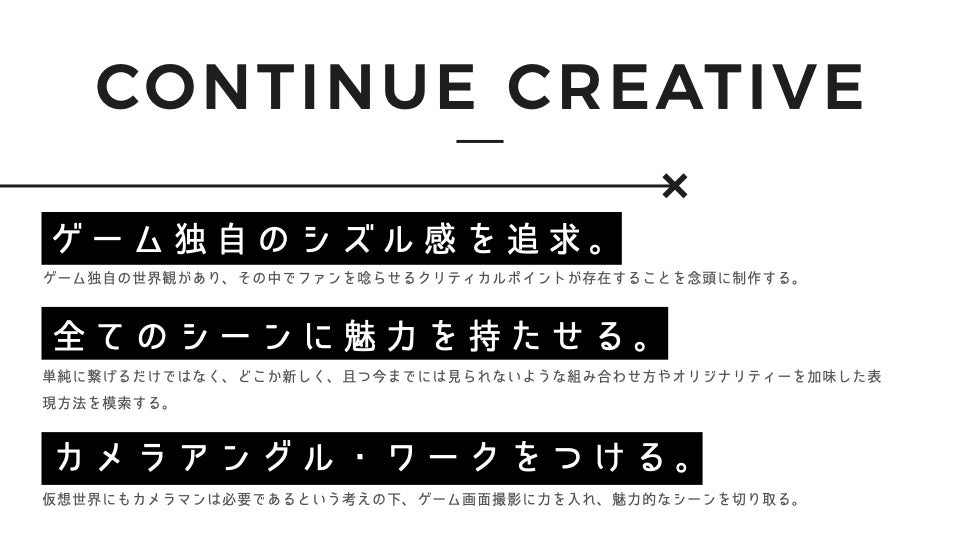 ゲームの魅力を最大限に引き出す「CONTINUE CREATIVE」では、以下の3要素を強みとしています。