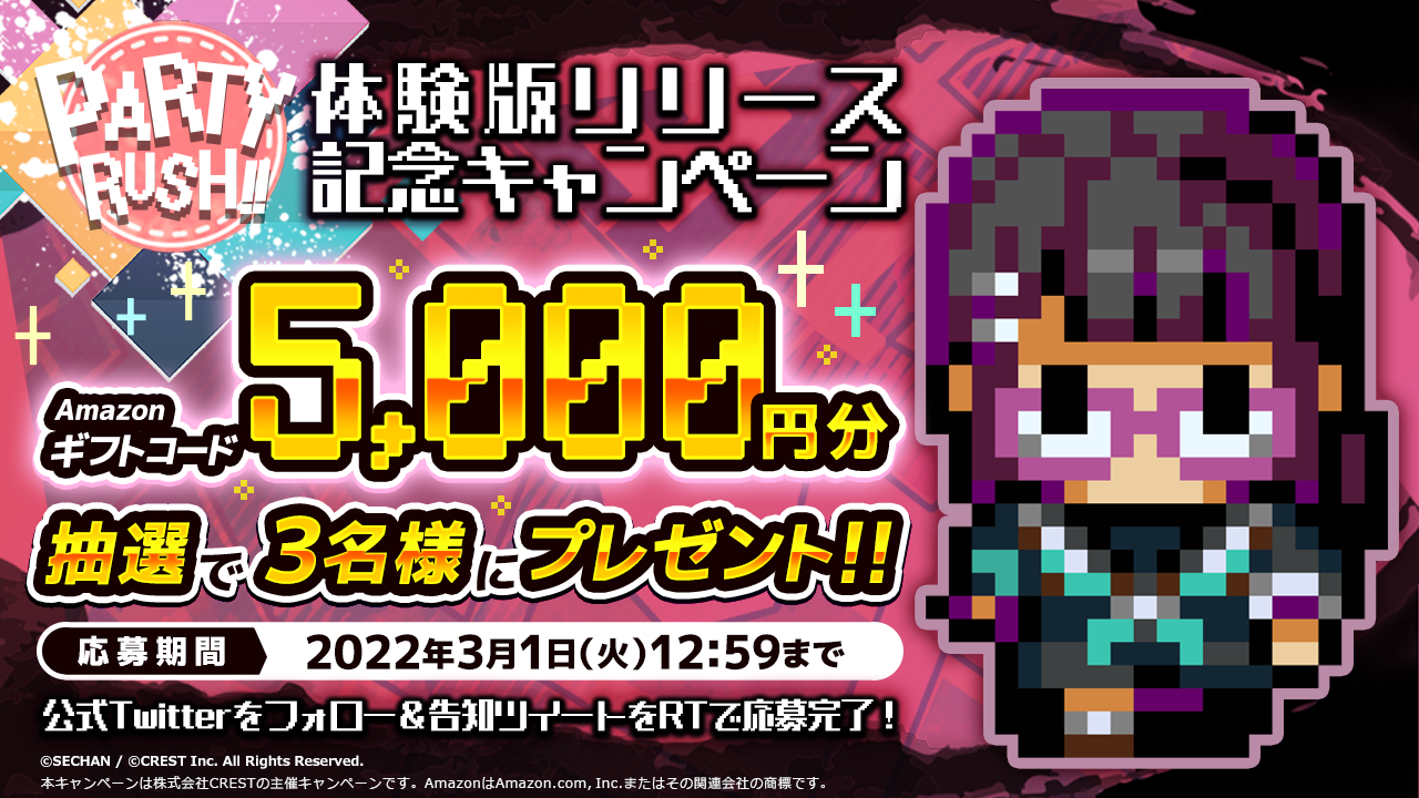 株式会社CREST(以下「CREST」)は、SECHAN制作の新作RPGゲーム『パーティラッシュ!!』が「Steam Next Fest 2022 2月エディション」へ参加し、合わせてSteamⓇ用体験版の配信を開始したことをお知らせいたします。
