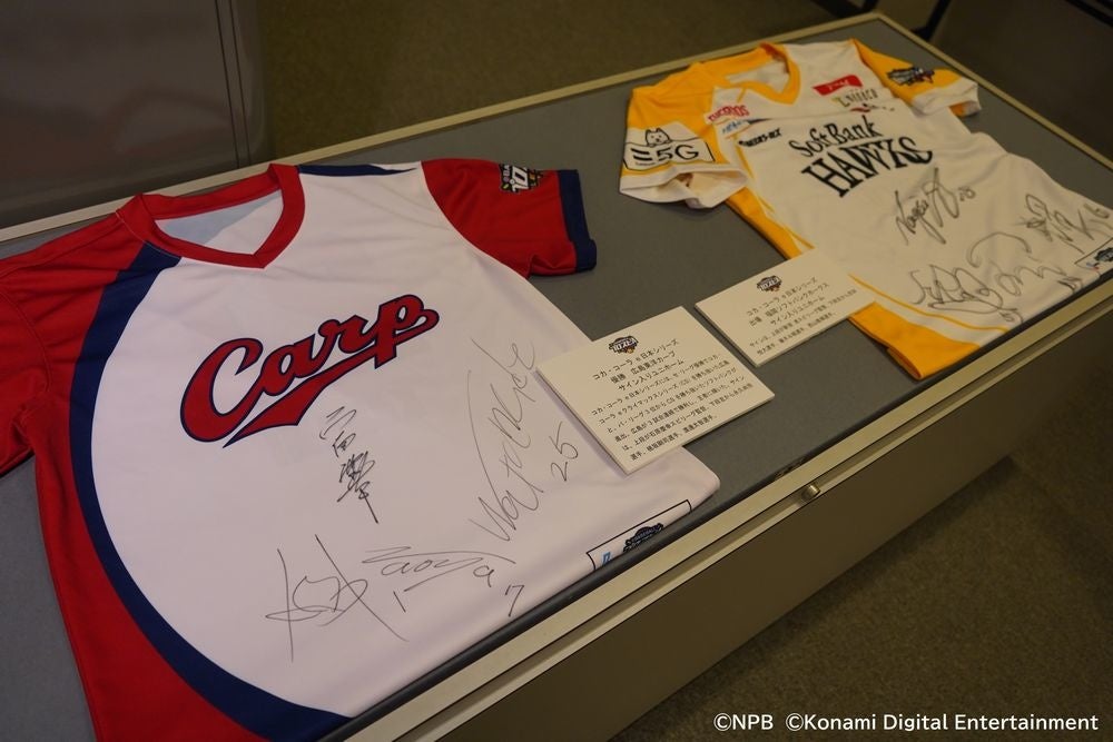 この日、野球殿堂博物館で行われた寄贈式には、1月22日(土)に行われた「コカ・コーラ e日本シリーズ」を制し、MVPに輝いた広島東洋カープの渡邊太智選手のほか、野球殿堂博物館・庄司正信館長と主催者のNPB・加賀山昭宏事業本部長、コナミデジタルエンタテインメント・山本竜彦執行役員が出席しました。