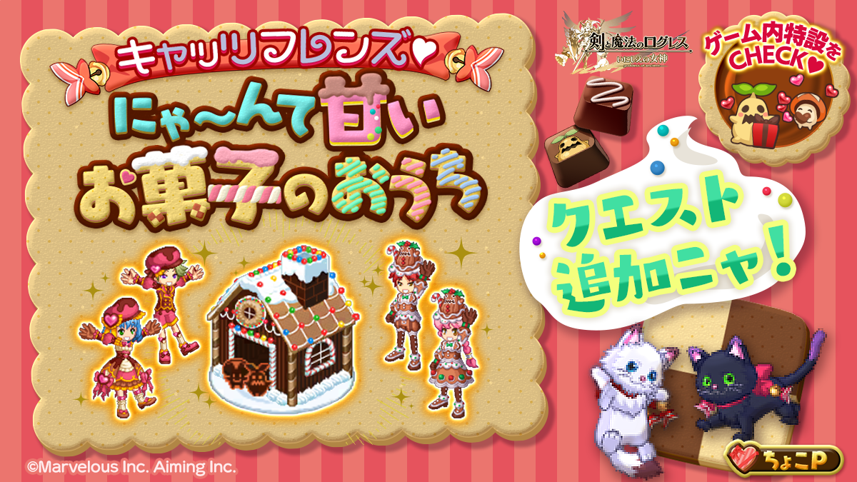 株式会社マーベラス(代表取締役社長:許田 周一/所在地:東京都品川区)は、スマートフォン向け本格オンラインRPG『剣と魔法のログレス いにしえの女神』において、2022/2/22(火)に「ジョブ別 アトランティス確率アップガチャ」の販売、および「キャッツフレンズ♡にゃ~んて甘いお菓子のおうち」のクエスト追加、「みんな集まれ!ハンタークッキング!~もっといい味ダシなさい!~」の開催を含むアップデートを行ったことをお知らせいたします。