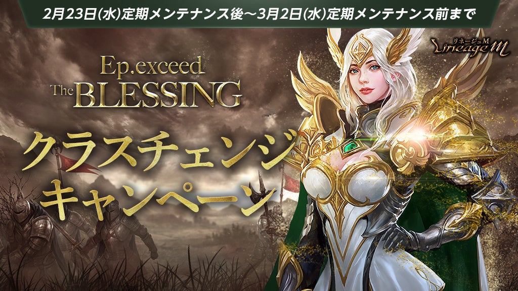 「Ep.exceed ~The BLESSING~ 」アップデートを記念し、ゲーム内「ショップ」にてクラスチェンジに必要なアイテム「クラスチェンジ(神聖剣士)」を購入すると、指定したキャラクターのキャ ラクター名と経験値を維持したまま職業を「神聖剣士」に変更できる、「クラスチェンジキャンペーン」を開催します。