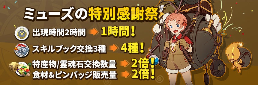 イベント期間中は、1時間毎に放浪商人ミューズが登場するようになり、スキルブックの追加や各種商品の購入回数が増加いたします。この機会に多くの商品を入手してください。