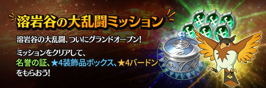 イベント期間中に「溶岩谷の大乱闘」に参加することで名誉の証や★4装飾品ボックスなどの報酬を獲得できます。また、全てのミッションをクリアすると★4イマージェン「バードン」を最終報酬として受け取れます。