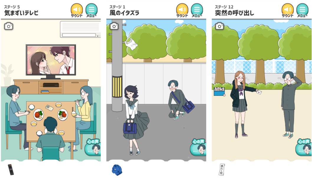▲左下のアイテムを使ってシゲキ(主人公)を助けよう!ヒントは心の声にあり