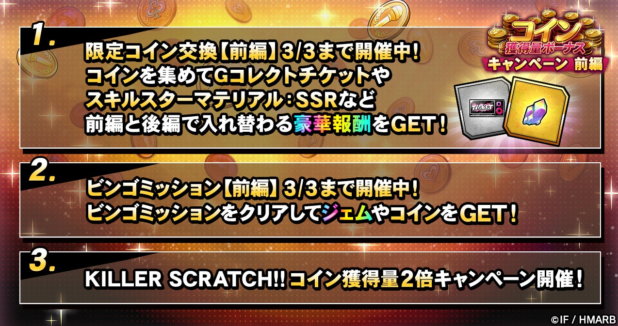 ビンゴミッションやログインボーナス、KILLER SCRATCH!!をプレイした際のコイン獲得量が2倍になるキャンペーンなどを開催しています。詳細はアプリ内お知らせをご確認ください。