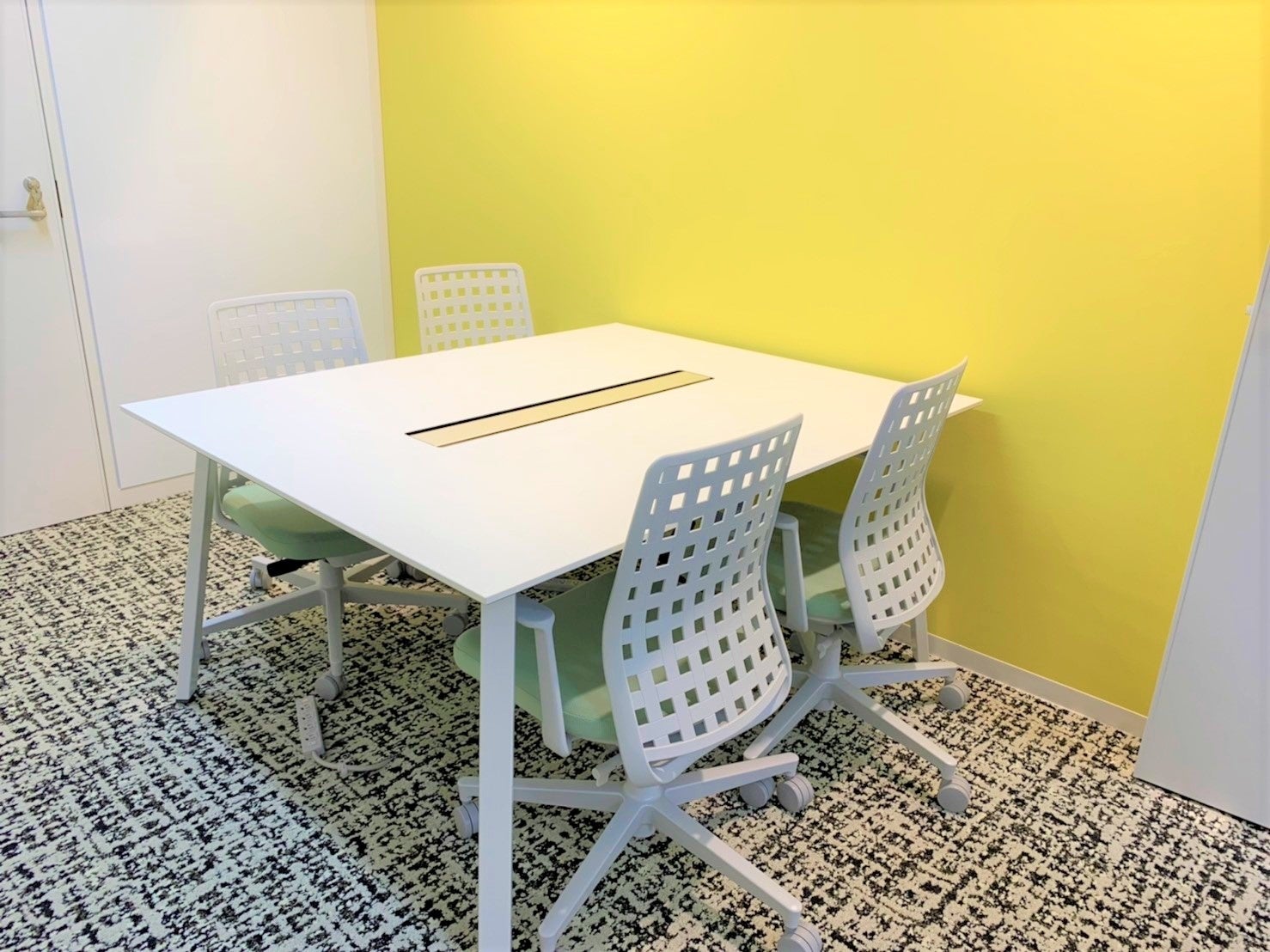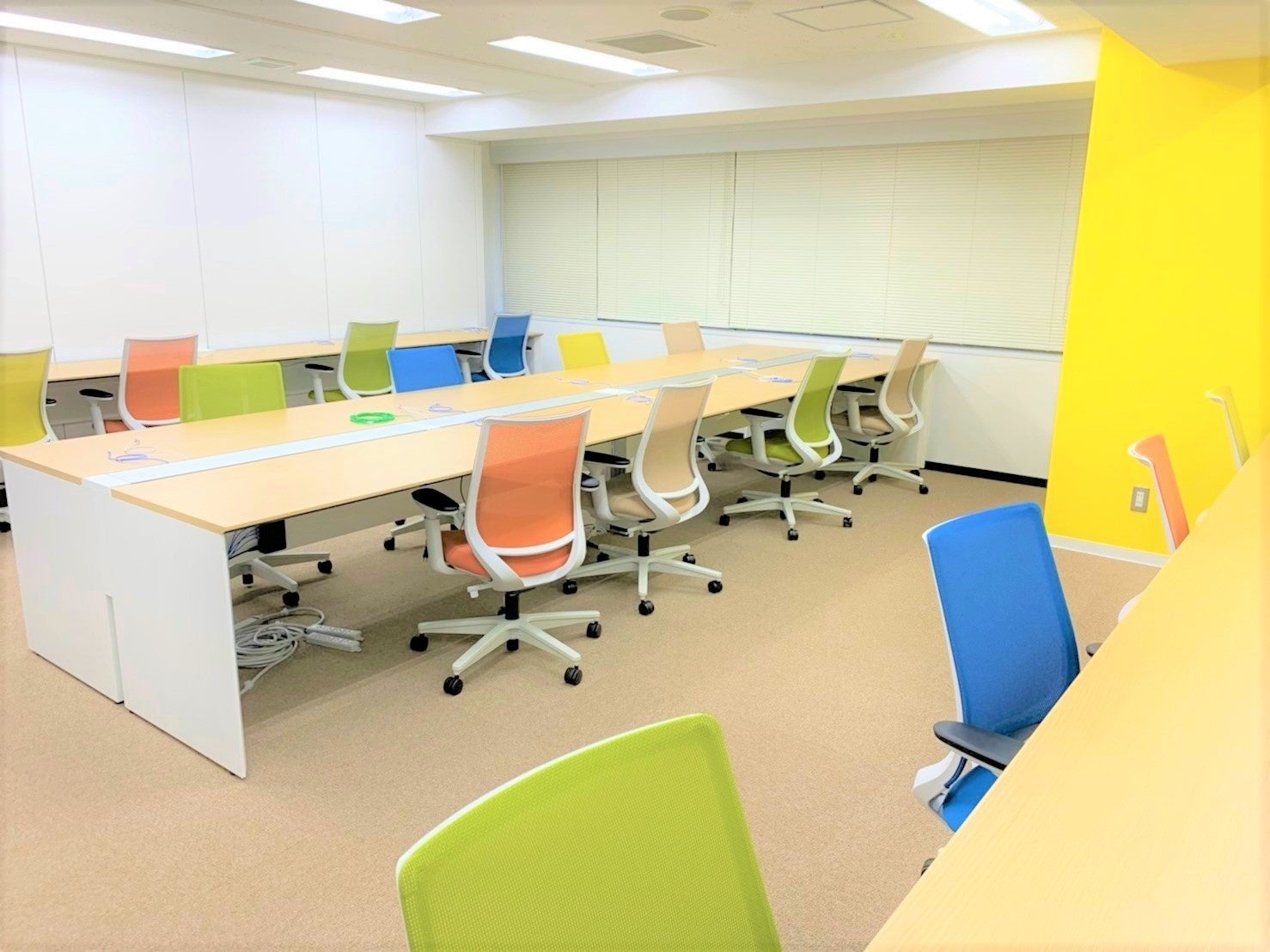 社員が普段から一番使用するプロジェクトルームでは、気分を上げて楽しく働けるように柱や壁、椅子などにさまざまカラーを取り入れました。